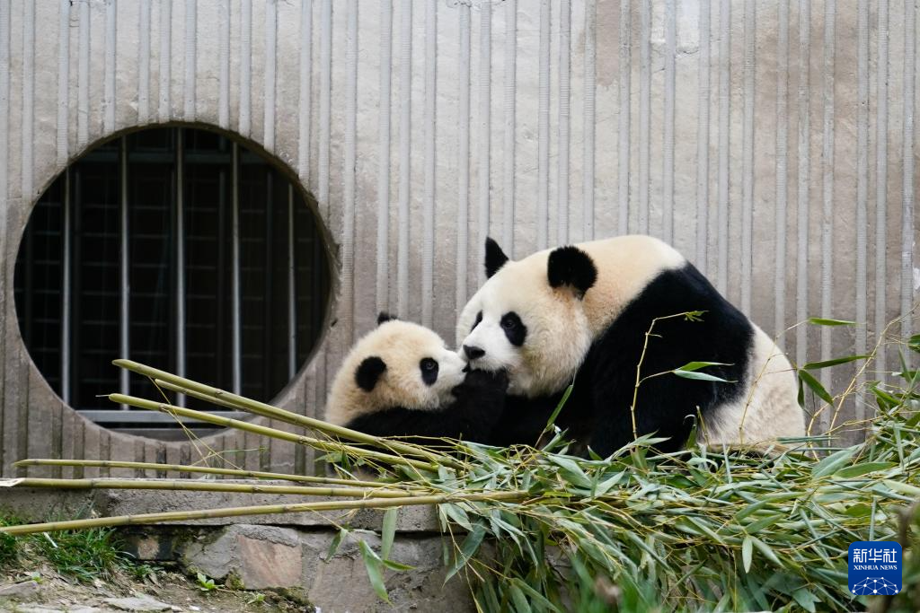 3月28日,在中国大熊猫保护研究中心卧龙神树坪基地,大熊猫“璨璨”和幼崽玩耍。