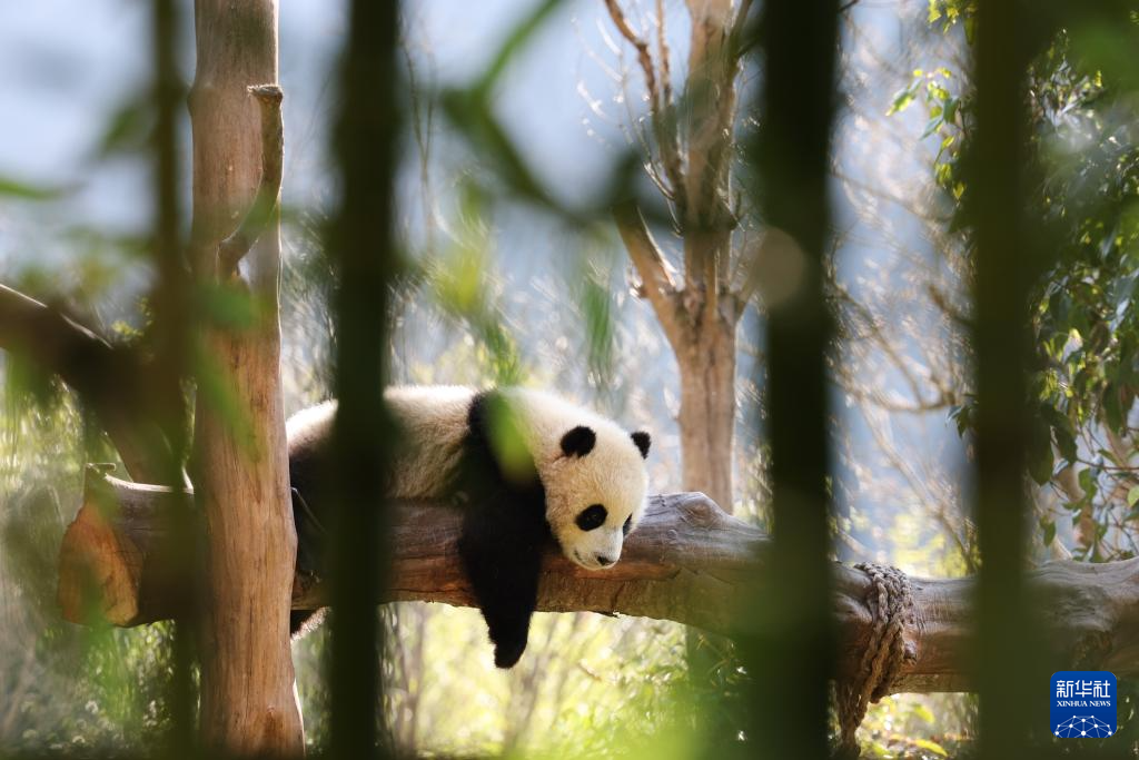 3月27日,在中国大熊猫保护研究中心卧龙神树坪基地,大熊猫幼崽在树上休憩。