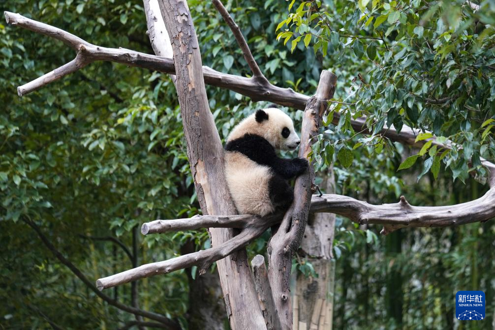 3月28日,在中国大熊猫保护研究中心卧龙神树坪基地,大熊猫“福宝”在树上玩耍。