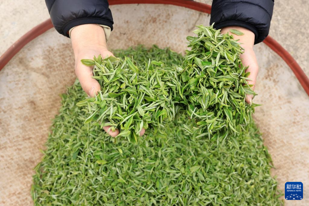 3月29日,在湖北省武汉市黄陂区木兰湖绿岛茶园,茶厂工作人员展示明前茶嫩芽。