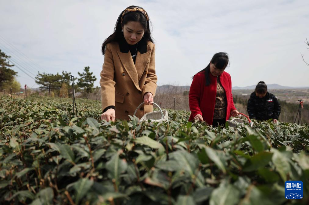 3月29日,山东省临沂市沂南县铜井镇龙泉村茶农在农场采摘明前茶。