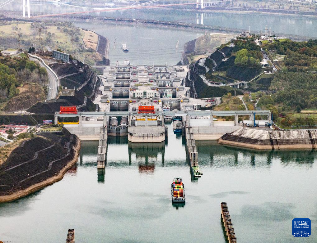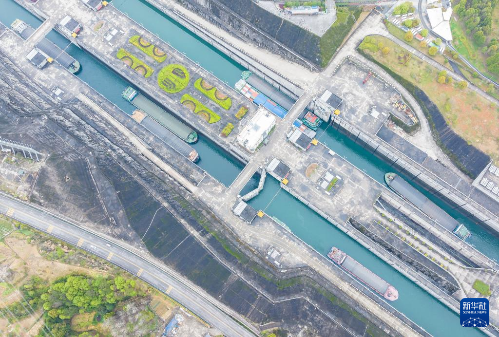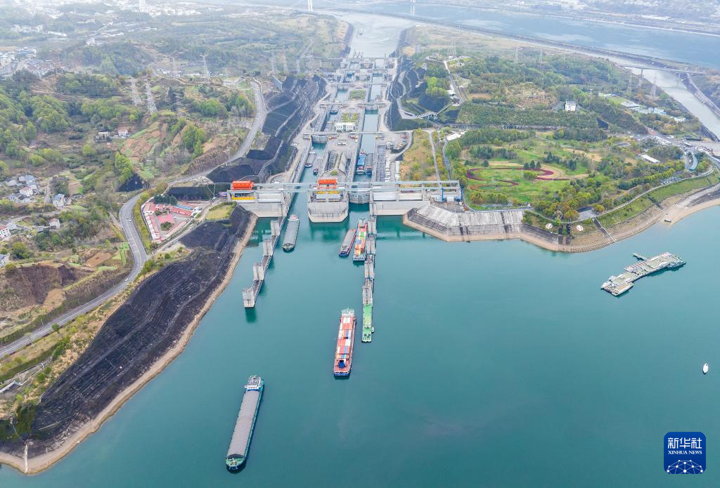 3月29日,在湖北宜昌,船舶有序通过三峡双线五级船闸(无人机照片)。