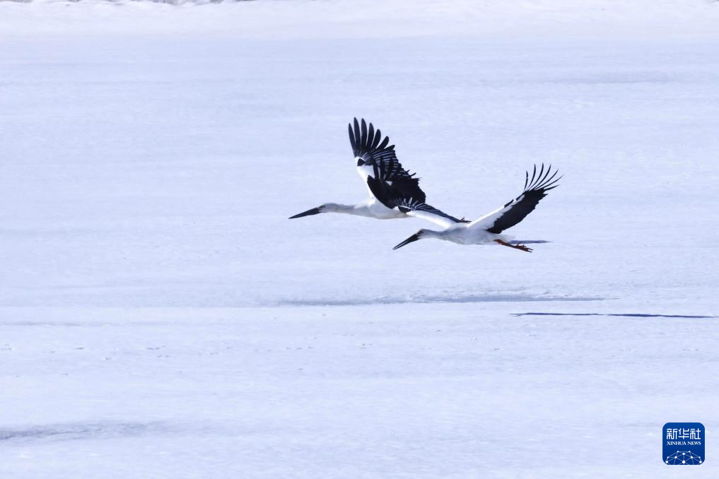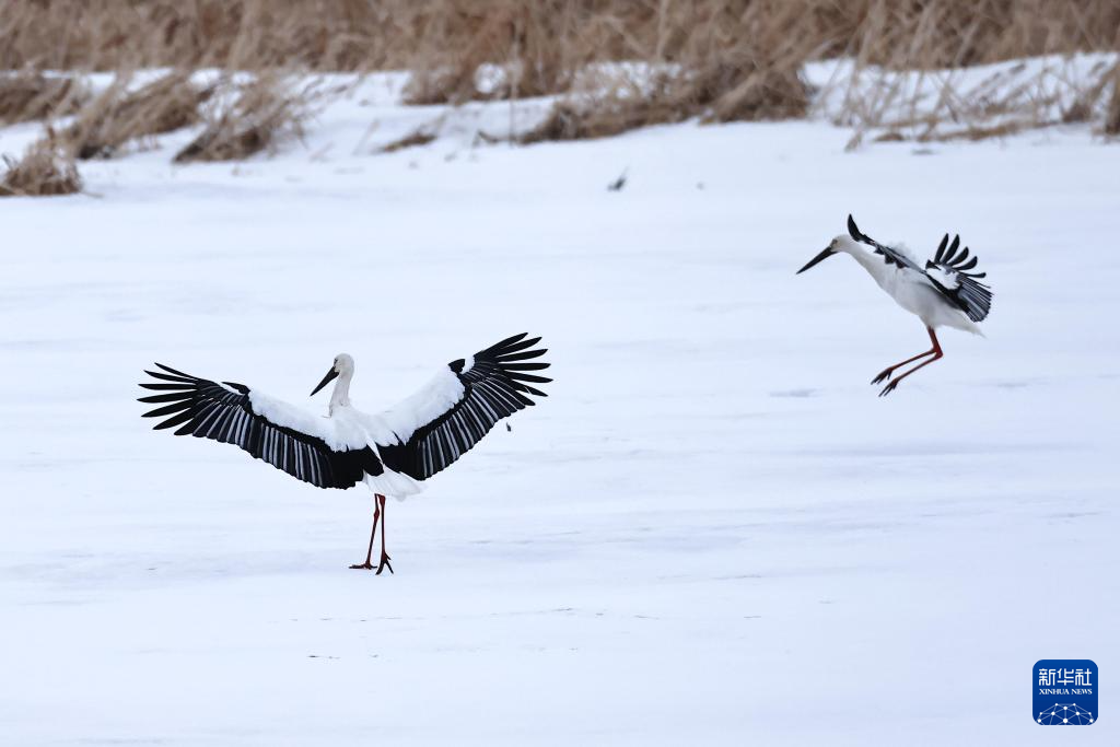 3月25日,两只东方白鹳在黑龙江省抚远市的一处雪地上“起舞”。