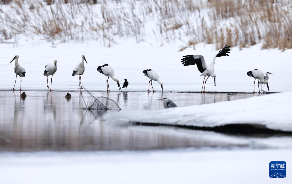 3月25日,在黑龙江省抚远市的一处水域,东方白鹳在觅食。