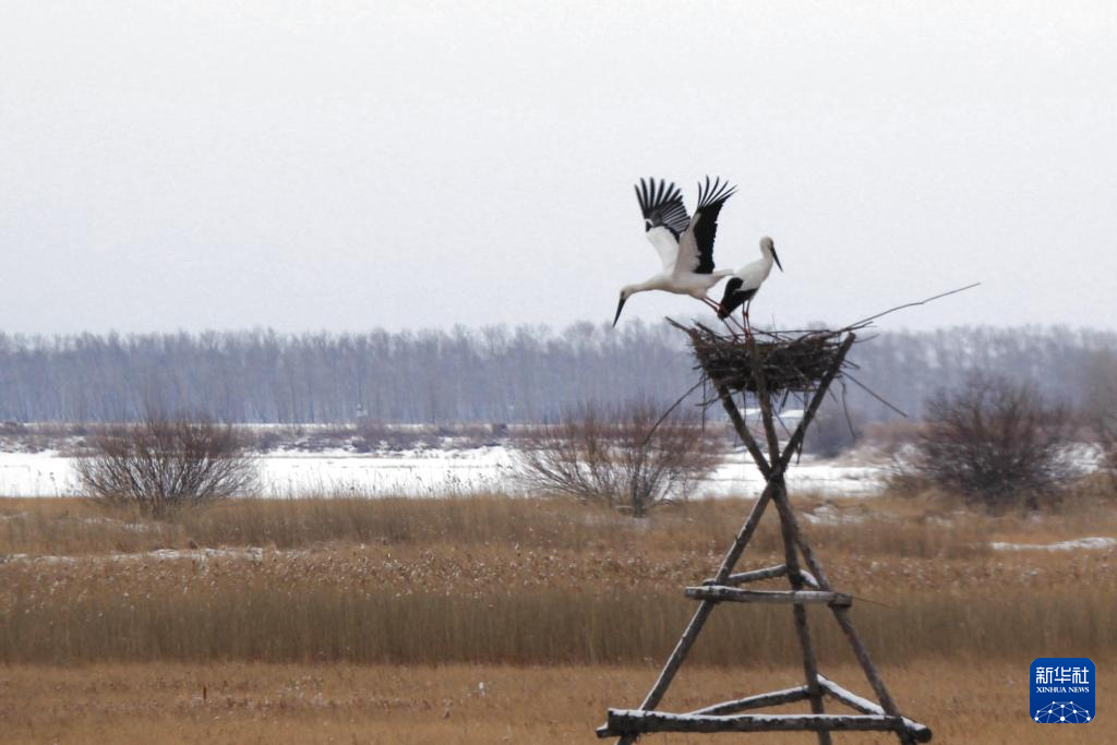 3月27日,一对东方白鹳在黑龙江挠力河国家级自然保护区的千鸟湖湿地筑巢繁育。