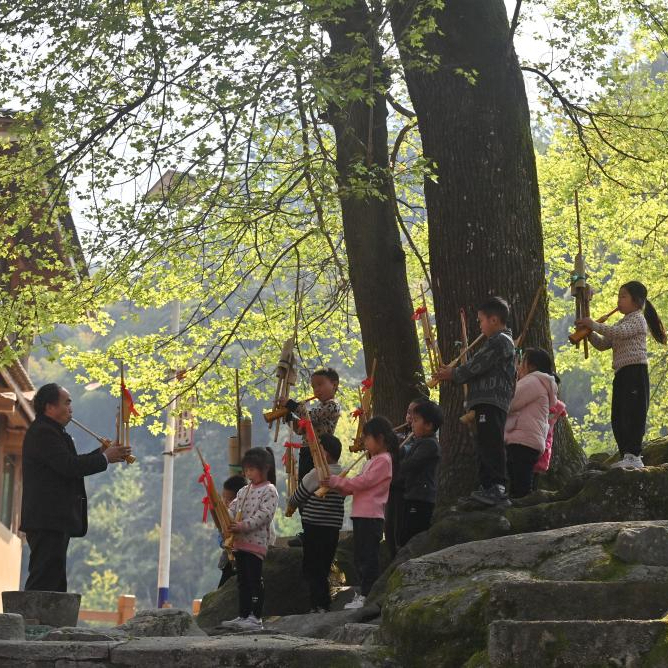 2024年10月5日,乌英苗寨的孩子们在吹芦笙。