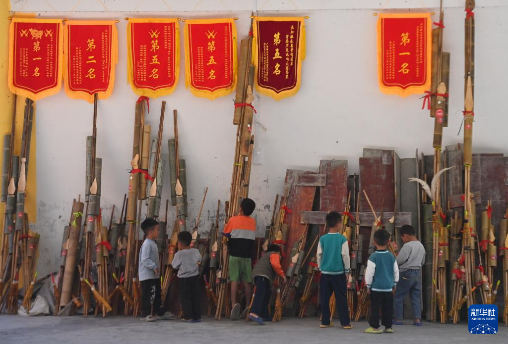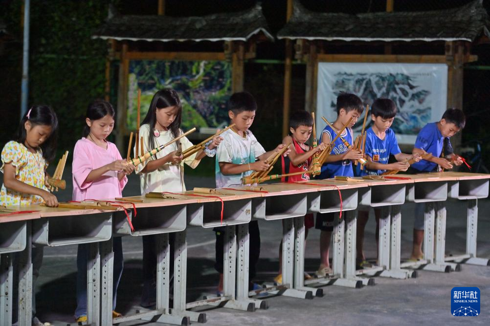 2024年8月8日,乌英苗寨的孩子们在参加芦笙组装比赛。