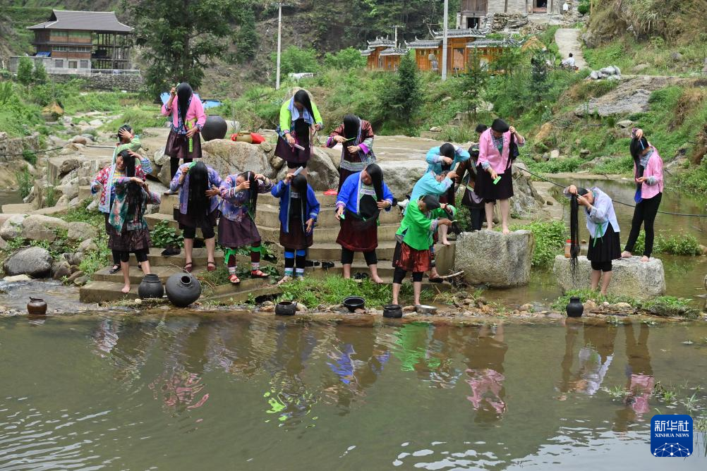 2023年4月19日,乌英苗寨的妇女们在开坛洗发文化节上梳洗。