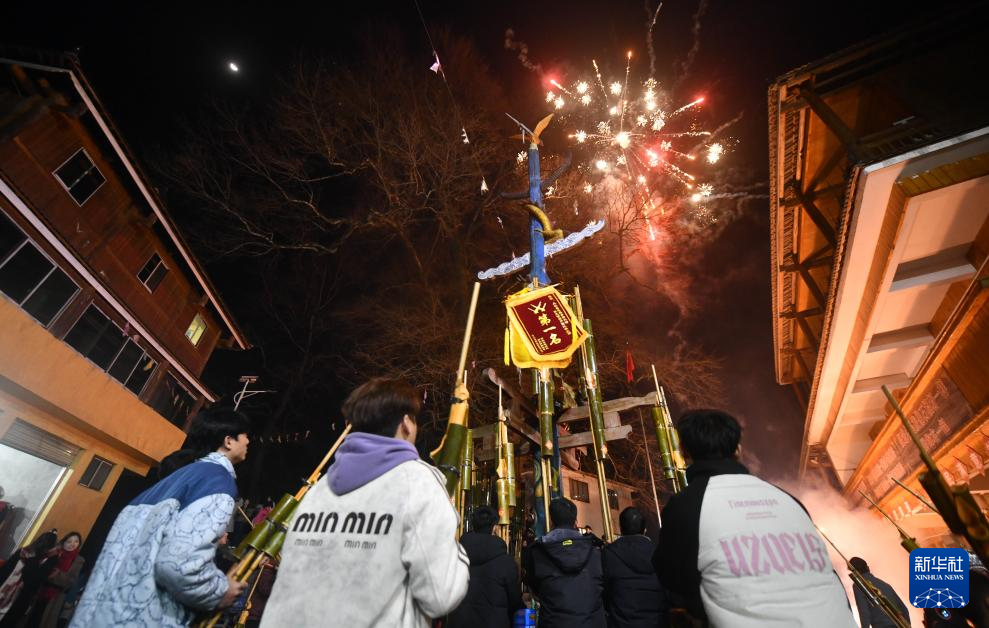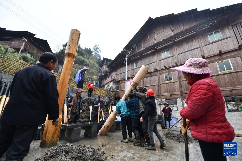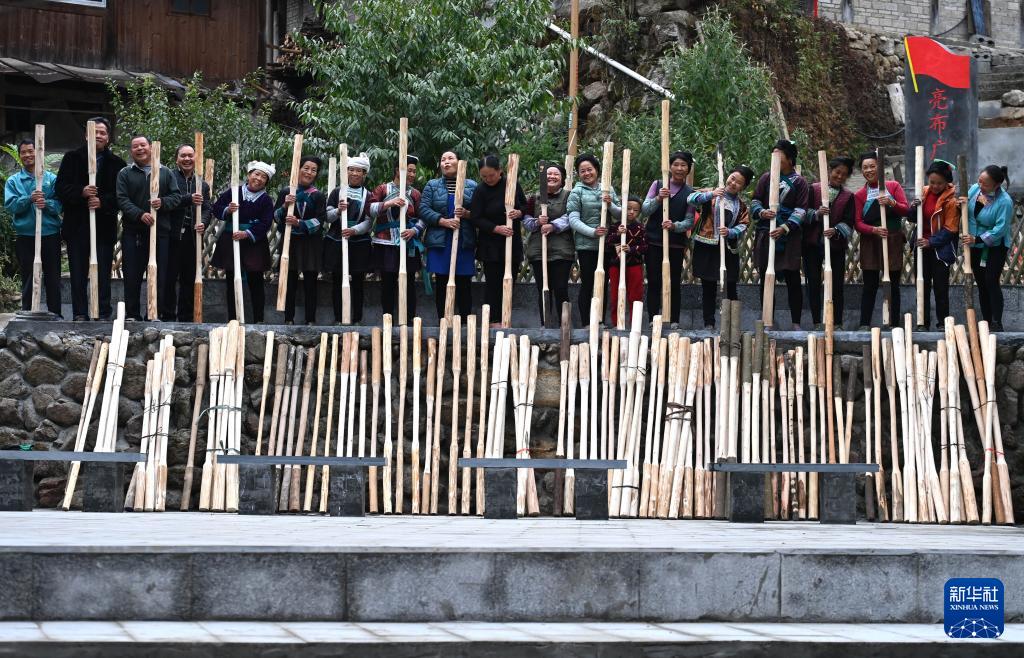 2022年11月19日,乌英苗寨村民在亮布文化小广场上竖起“亮布槌”。