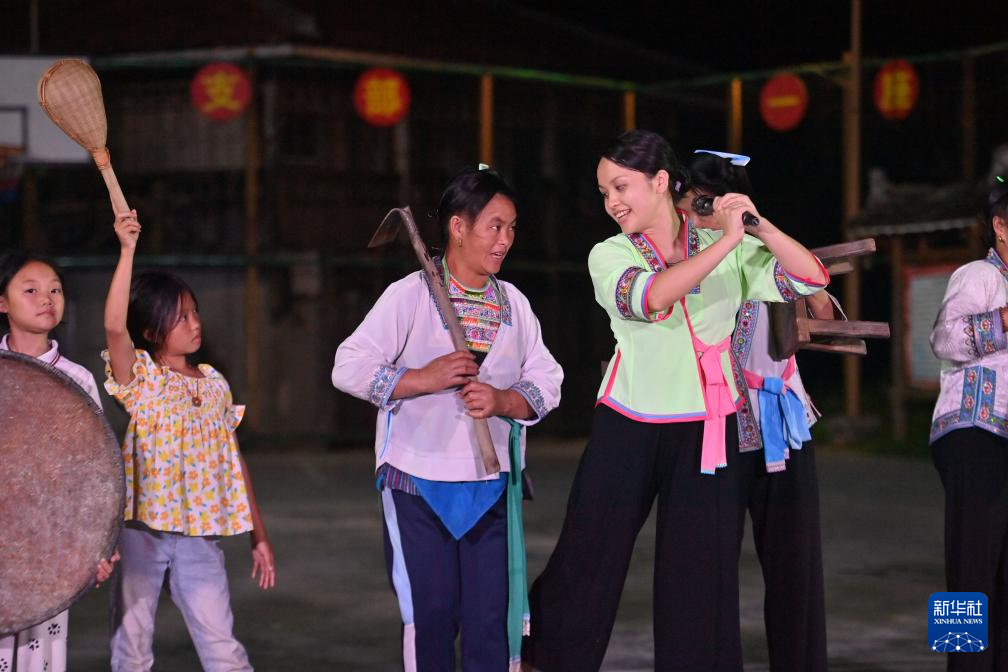 2024年8月9日,在乌英苗寨夜校课堂上,老师叶子雯(右)在指导村民练习非遗走秀。