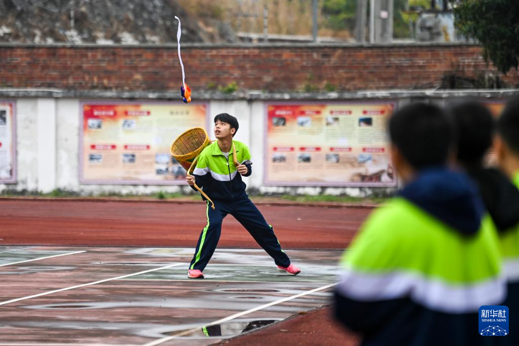 2月19日,在广西玉林市民族中学,学生们在体育课上体验背篓绣球。