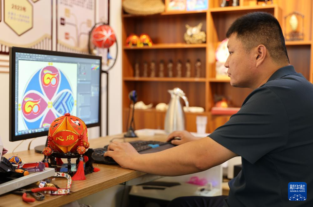 2024年10月17日,在广西靖西市一家绣球生产企业,刘昌磊在设计绣球产品。