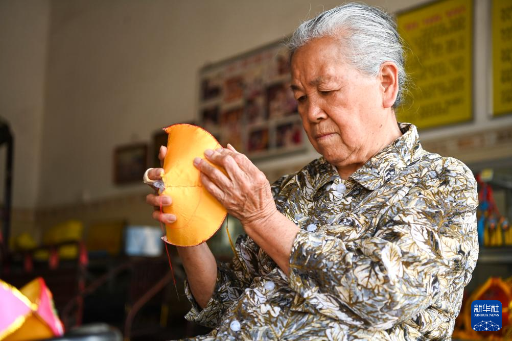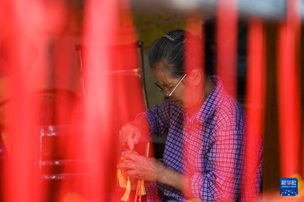 2024年4月2日,在广西靖西市,靖西壮族绣球制作技艺代表性传承人黄肖琴在家中制作绣球。