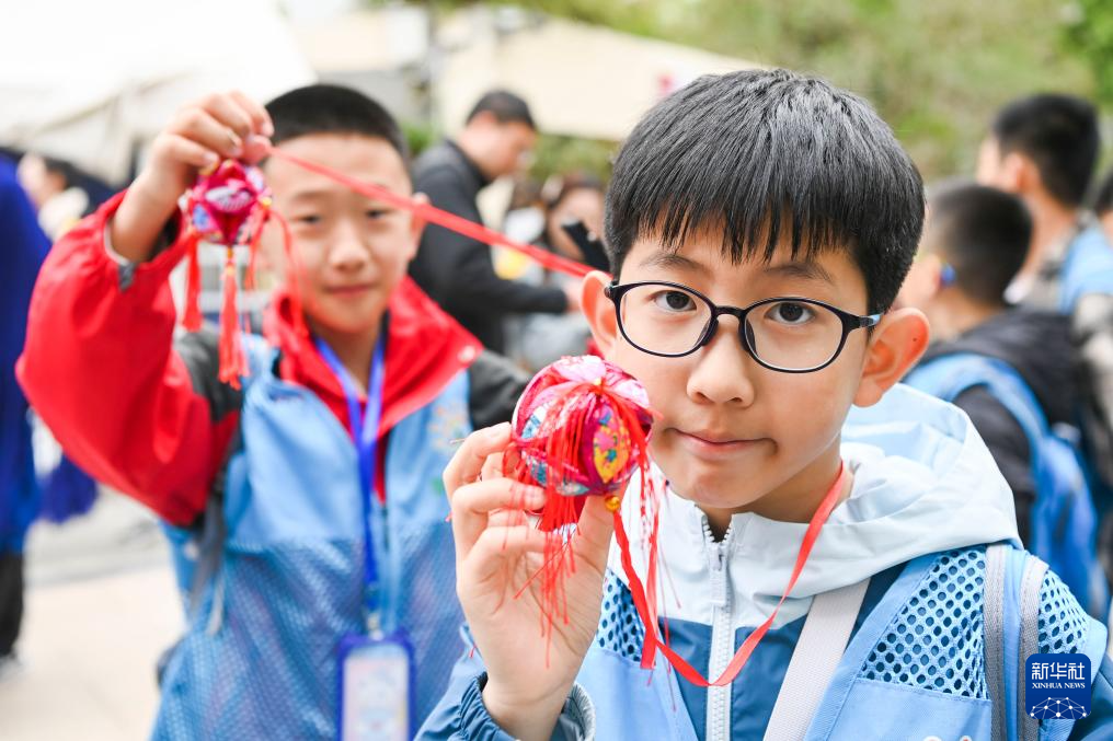 3月31日,在广西南宁举行的2025年“广西三月三·八桂嘉年华”活动现场,两名小学生在展示绣球。
