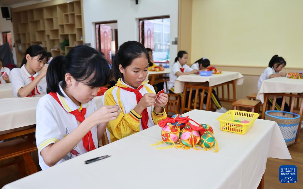 2024年10月17日,在广西靖西市第三小学,学生体验绣球制作。