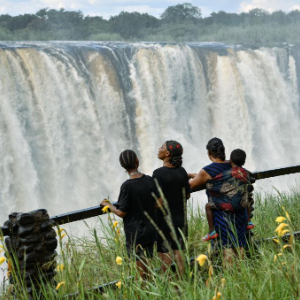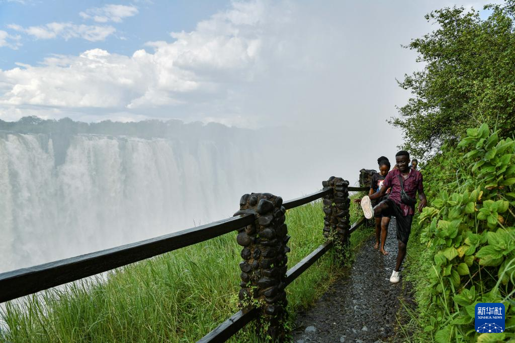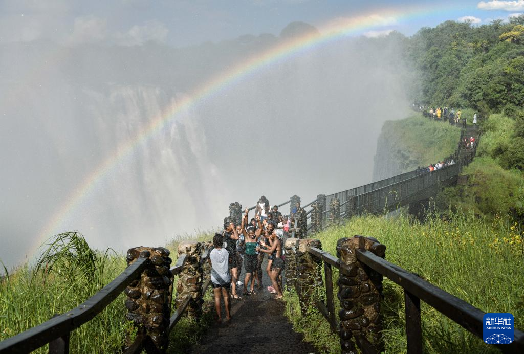 3月29日,游客在赞比亚一侧观赏维多利亚瀑布景色。