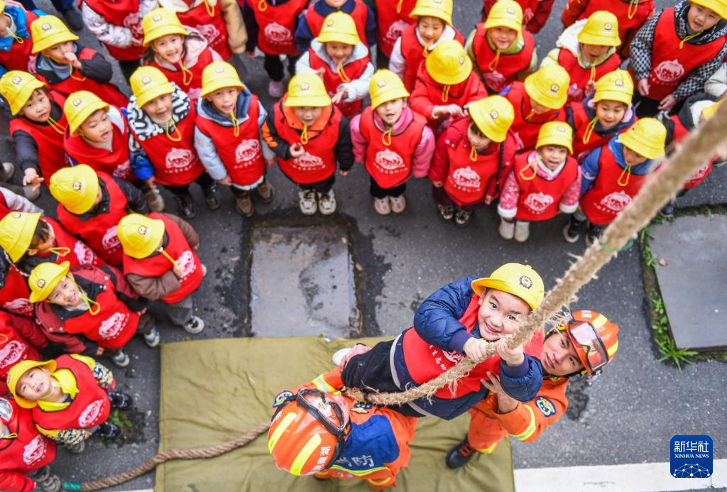 3月31日,在湖南省永州市道县消防救援大队,小朋友在消防救援人员的协助下体验绳索攀爬技能。