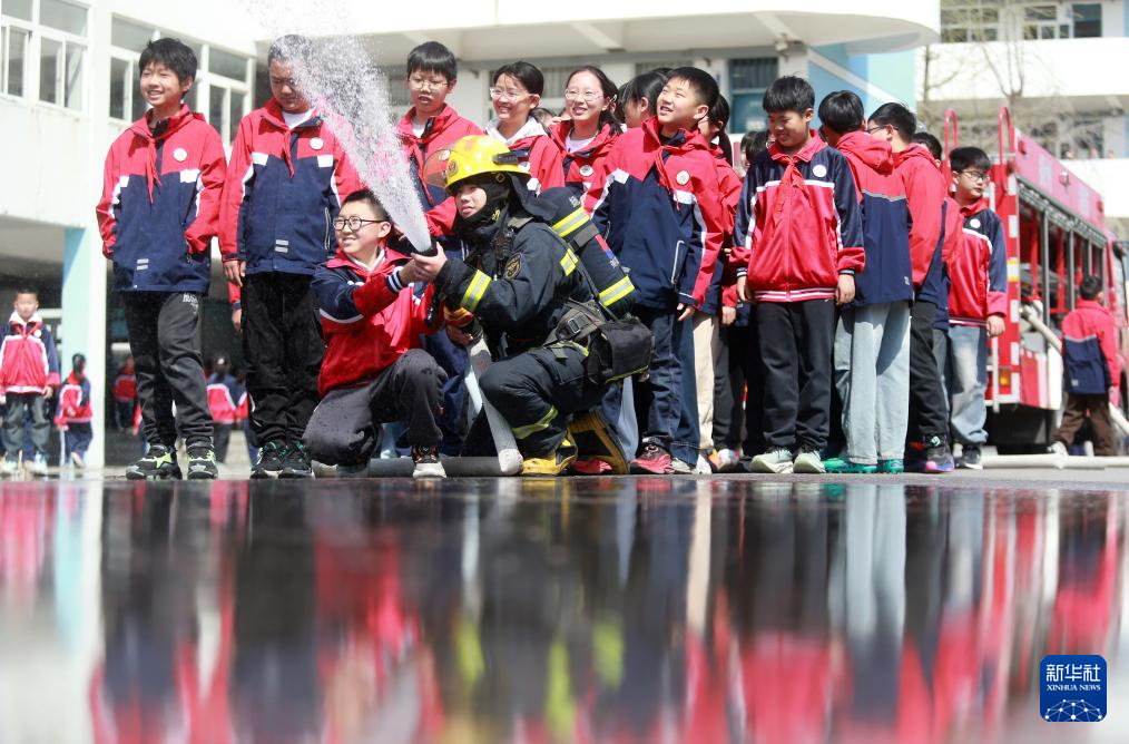 3月31日,在河南省商丘市睢县凤翔九年一贯制学校内,小学生(左)在消防员的指导下体验使用消防水枪。