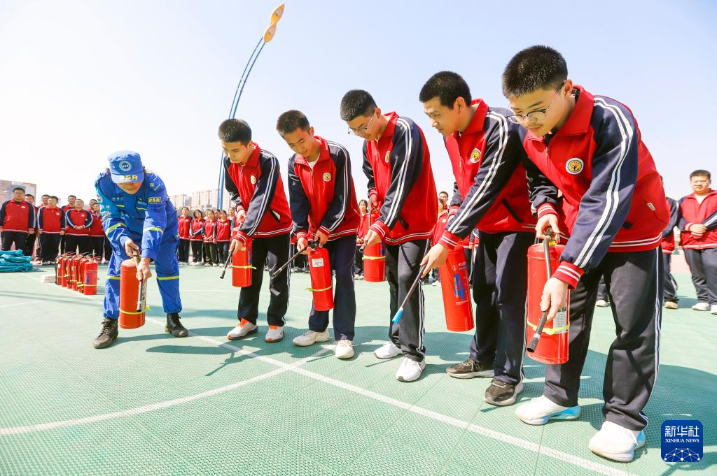 3月31日,河北省遵化市第一中学的学生在学习使用灭火器。