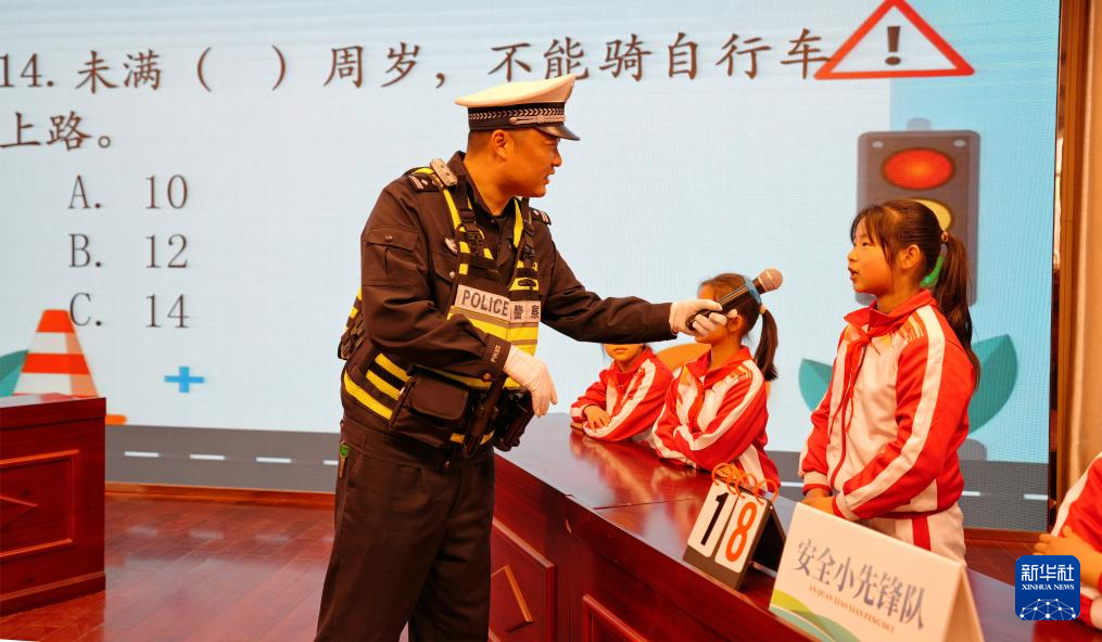 3月31日,在江苏省海安市墩头镇中心小学,学生在交警的主持下参加交通安全知识竞答。