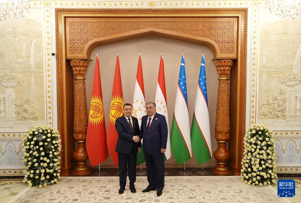 3月31日,在塔吉克斯坦苦盏,塔吉克斯坦总统拉赫蒙(右)与吉尔吉斯斯坦总统扎帕罗夫握手。