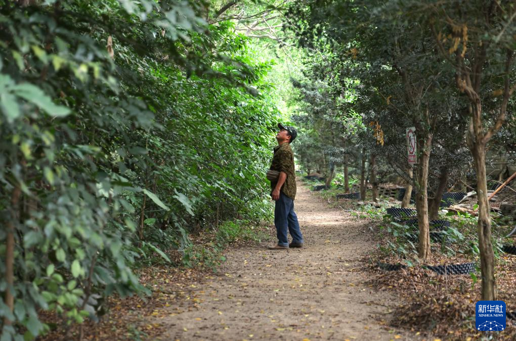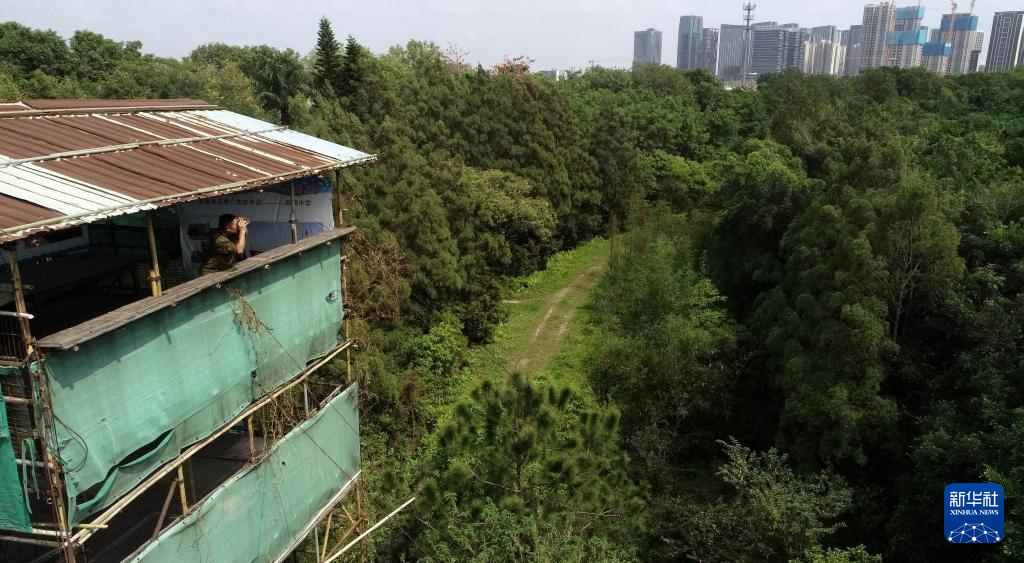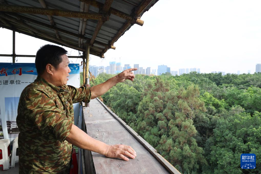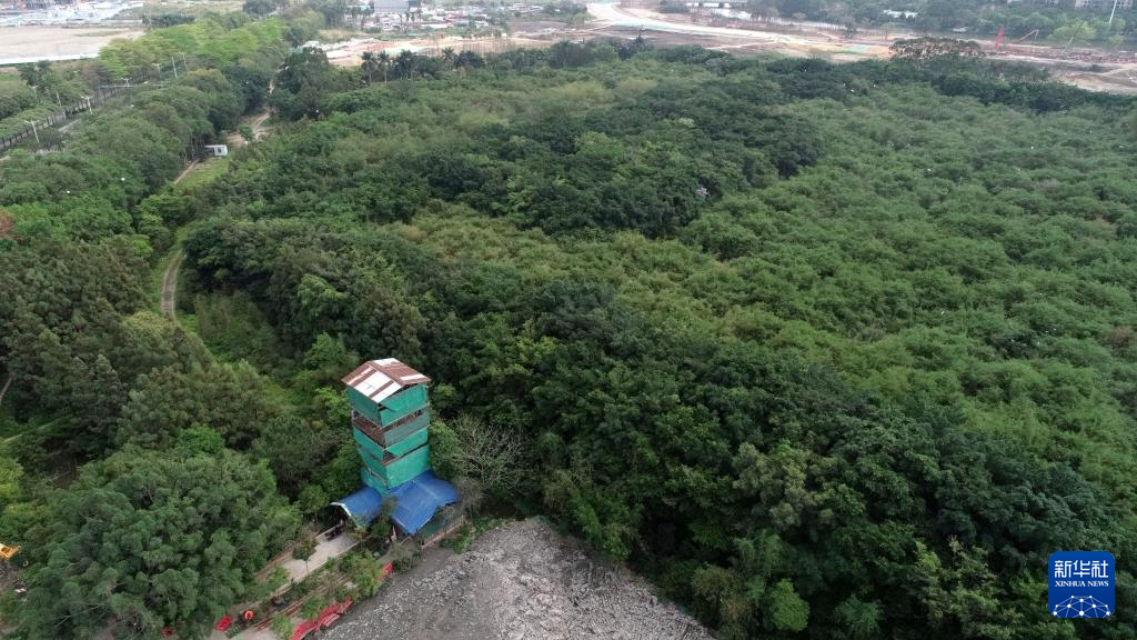 冼铨辉在观鸟台上观察鹭鸟(3月27日摄,无人机照片)。