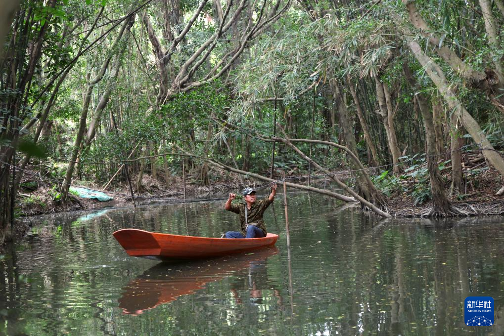 冼铨辉在“护鸟河”上察看(3月3日摄)。