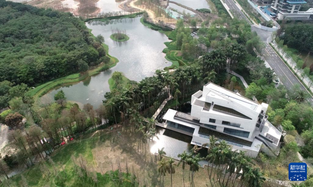 云鹭湿地公园里的云鹭湿地博物馆已建设完成(3月27日摄,无人机照片)。