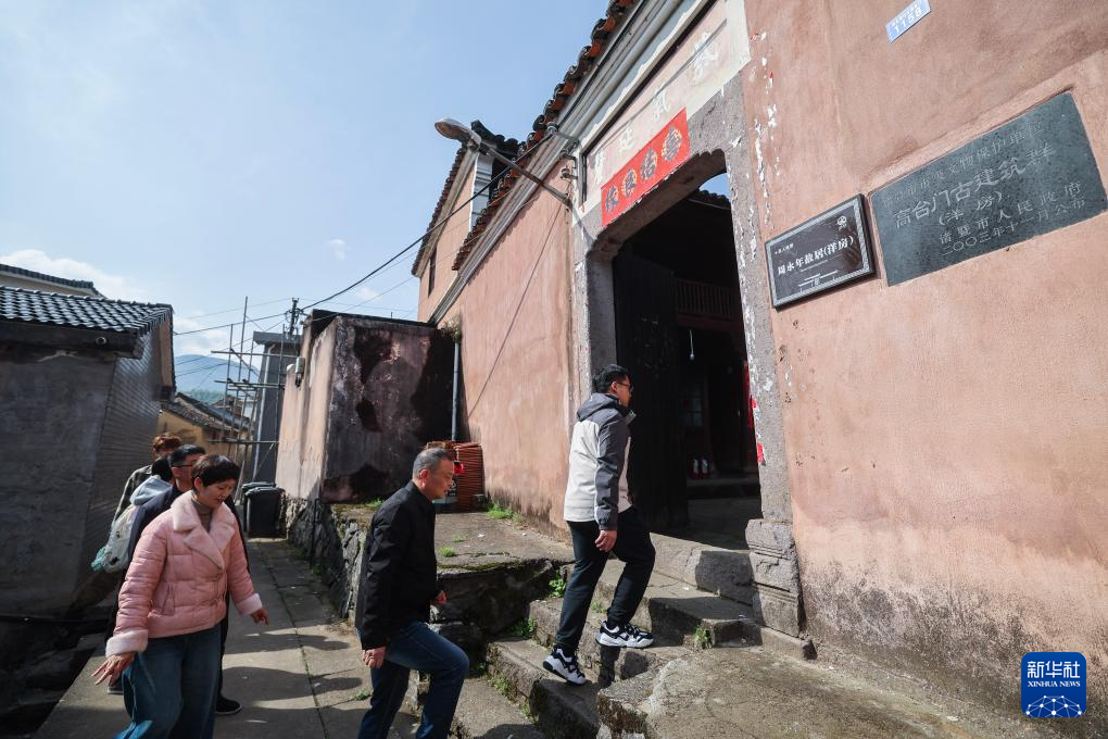4月1日,岭北镇文化特派员、浙江工业职业技术学院的讲师李亚(右一)与岭北镇、村干部来到高台门古建筑群里查看古建筑的维保现状。
