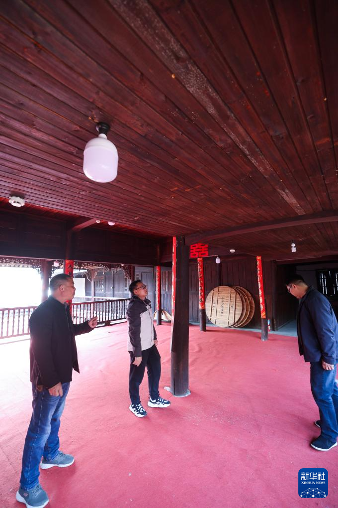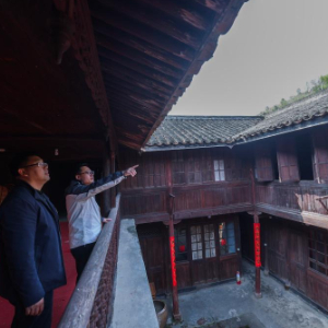 4月1日,岭北镇文化特派员、浙江工业职业技术学院的讲师李亚(右)与岭北镇党委委员楼炳在高台门古建筑群里查看古建筑的维保现状。