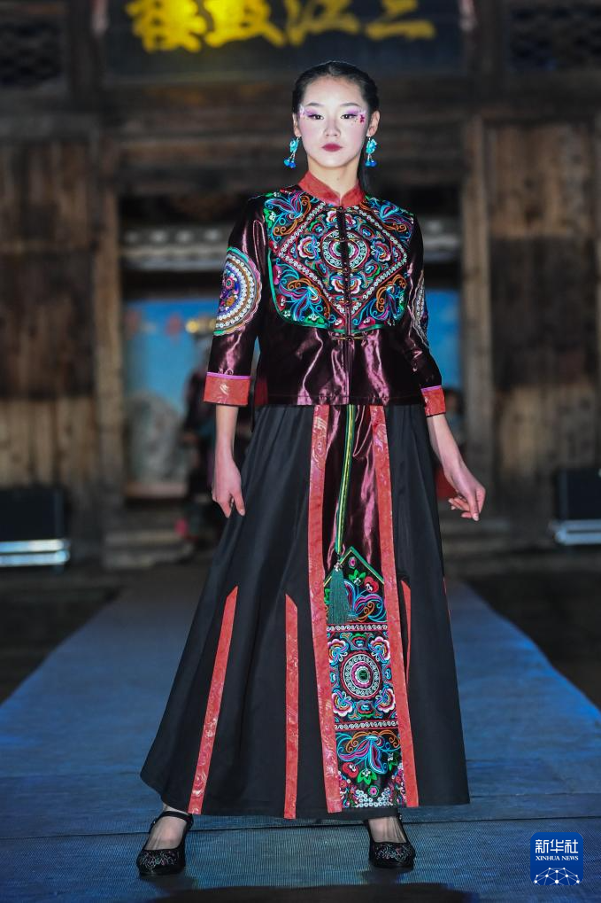 “广西三月三·八桂嘉年华”活动期间,广西柳州市三江侗族自治县侗族群众穿着民族服饰依次走上T台,展现侗绣独特民族风情及时尚变化,庆祝传统佳节。