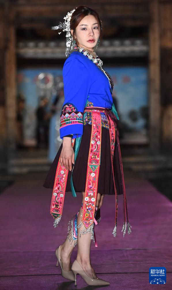 3月31日,在三江侗族自治县鼓楼广场,侗族群众在T台上展示民族服饰。