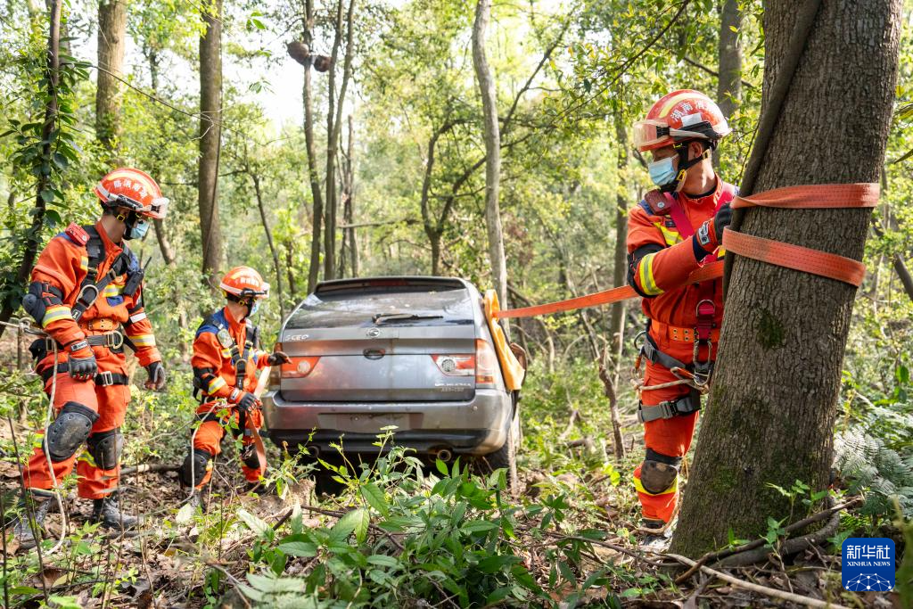 4月1日,在长沙岳麓山穿石坡湖附近,消防救援人员在进行车辆事故救援演练。
