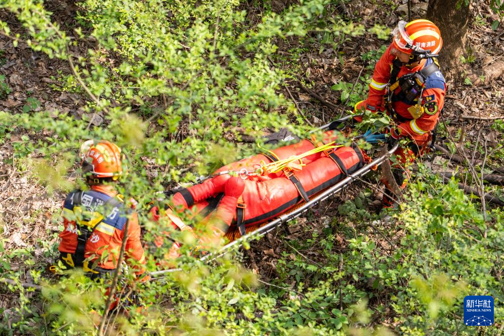 4月1日,在长沙岳麓山穿石坡湖附近,消防救援人员在进行边坡救援演练。