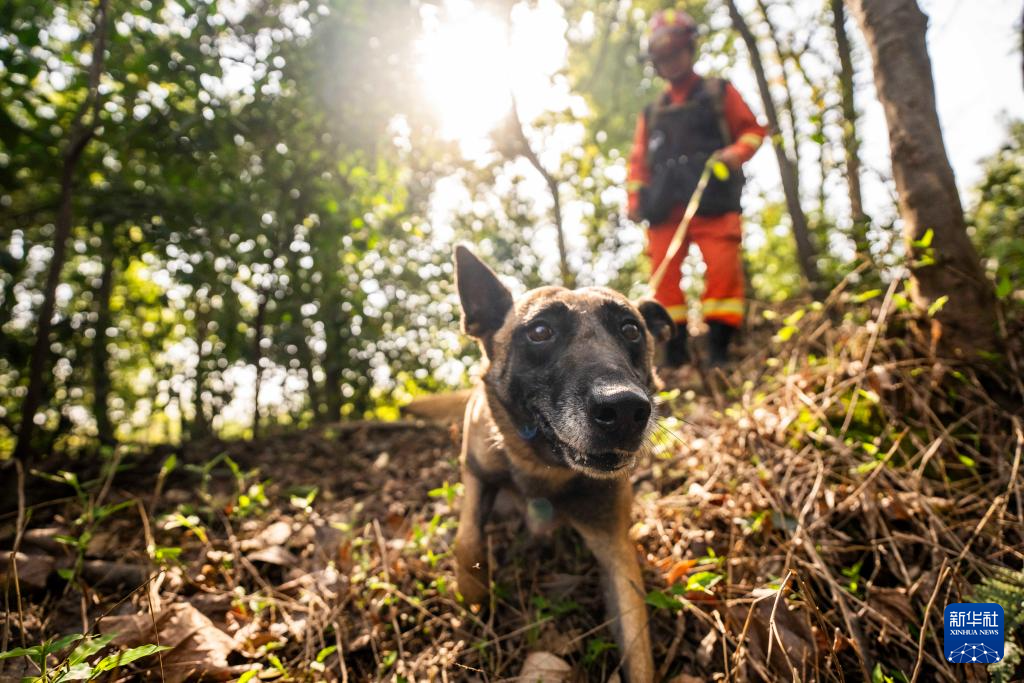 4月1日,在长沙岳麓山穿石坡湖附近,消防救援人员带领搜救犬进行大面积搜索演练。