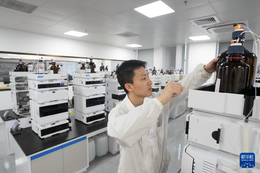 4月1日,在浙江国邦药业有限公司,工作人员在检验室对原料药进行液相检测。该公司致力于打造食药研产全球化产业基地,一季度实现满负荷生产,产值同比增长约14%。
