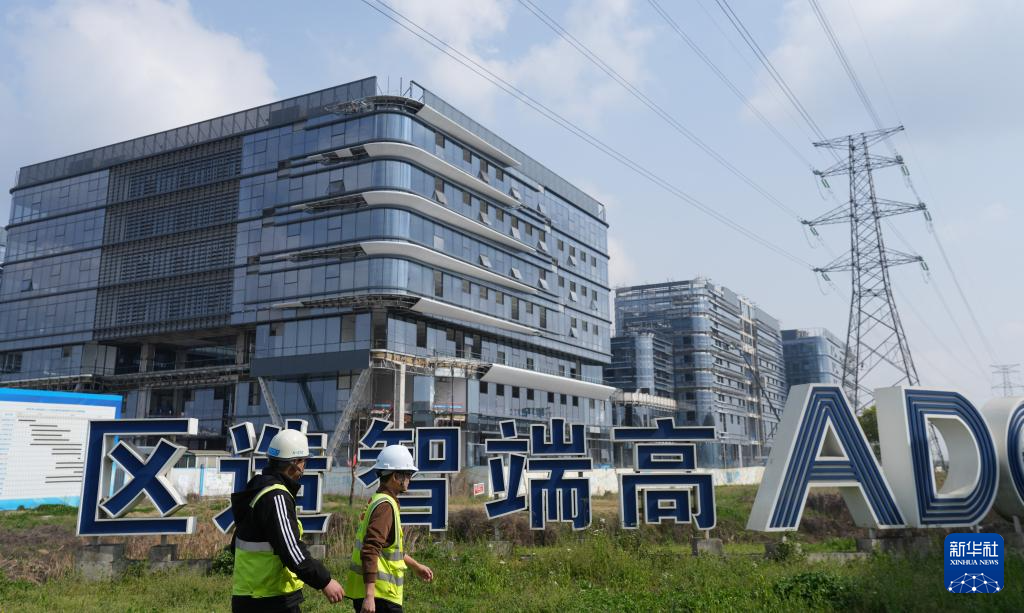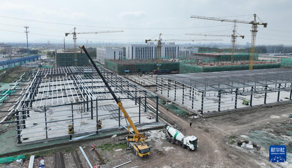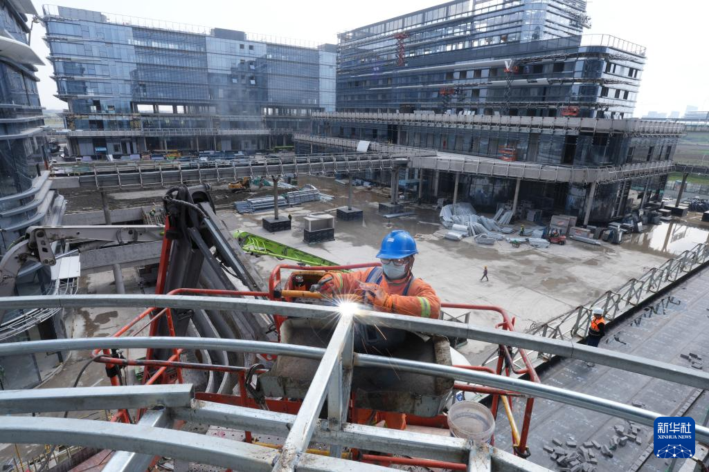 4月1日,建设工人在杭州湾创新生态园工作。该园区聚焦半导体材料、智能装备、医疗器械等新兴产业,计划于今年9月建成试运行。