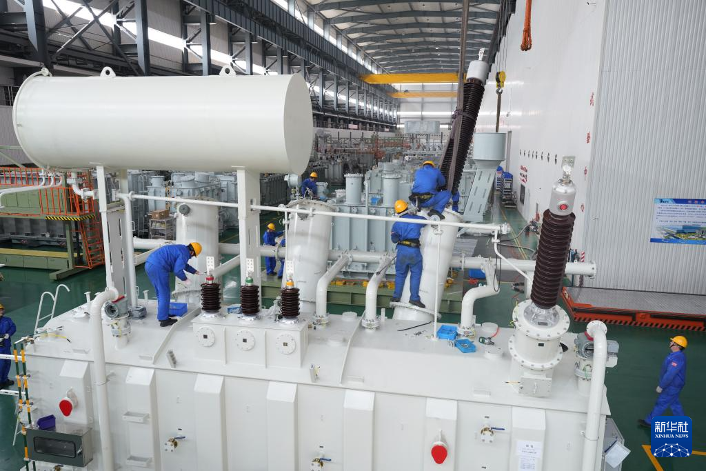 4月1日,在浙江白云浙变电气设备有限公司,工作人员在厂房装配22万伏特高压油浸式变压器。该公司输变电设备出口全球,一季度产值达2.2亿元。