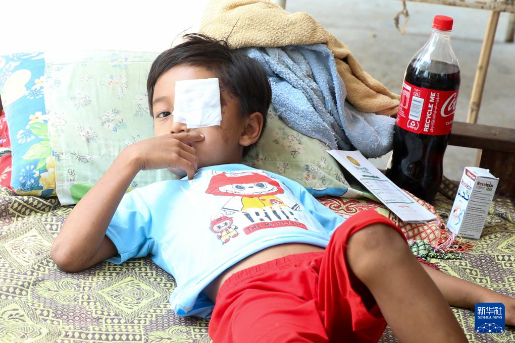 4月1日,在缅甸实皆市,一名地震中受伤的儿童接受医疗救治。
