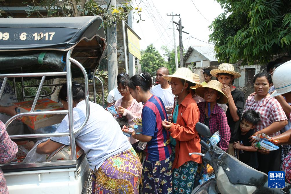 4月1日,在缅甸实皆市,志愿者向受灾民众发放生活物资。