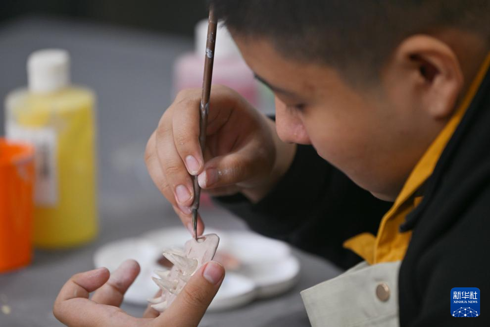 学生在特殊教育实训基地给陶器上色(3月31日摄)。