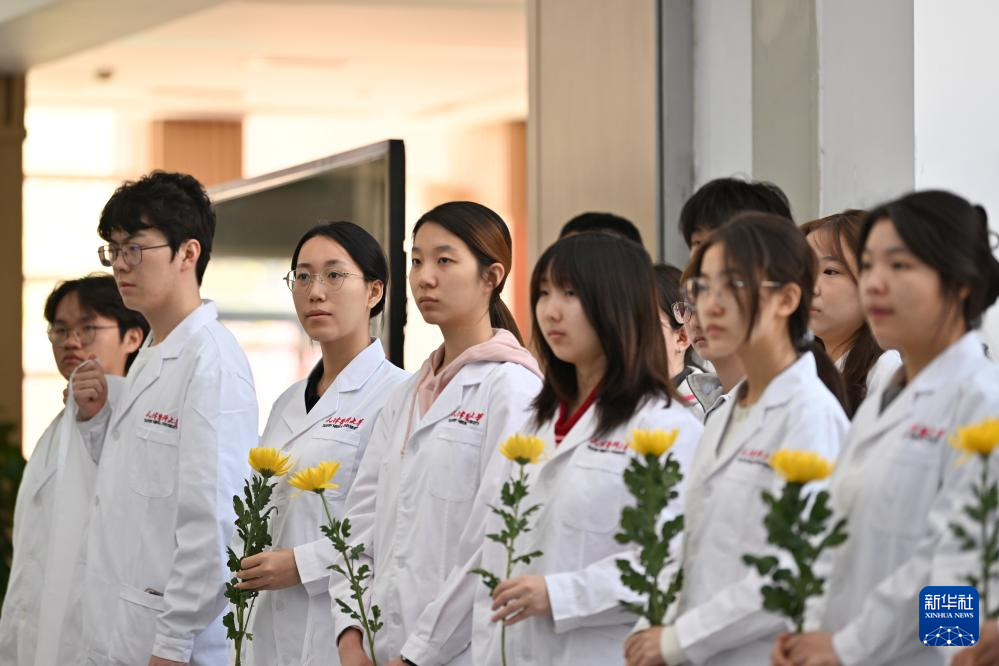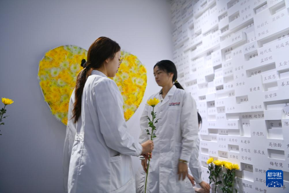 4月2日,学生在天津医科大学“大体老师”纪念墙前献花。