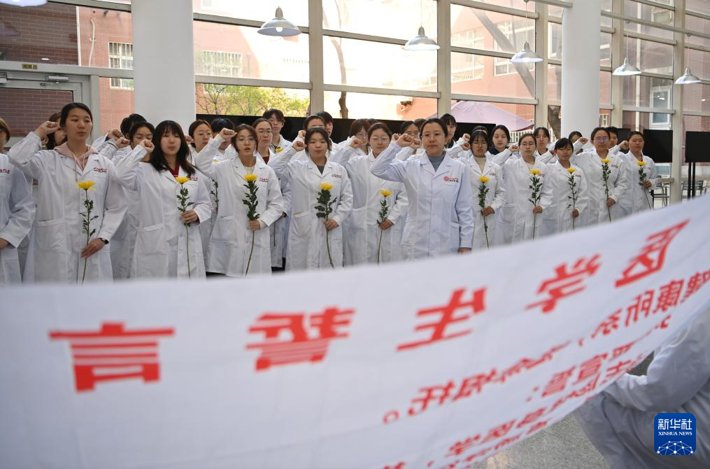 4月2日,在天津医科大学图书馆,老师带领学生宣誓。
