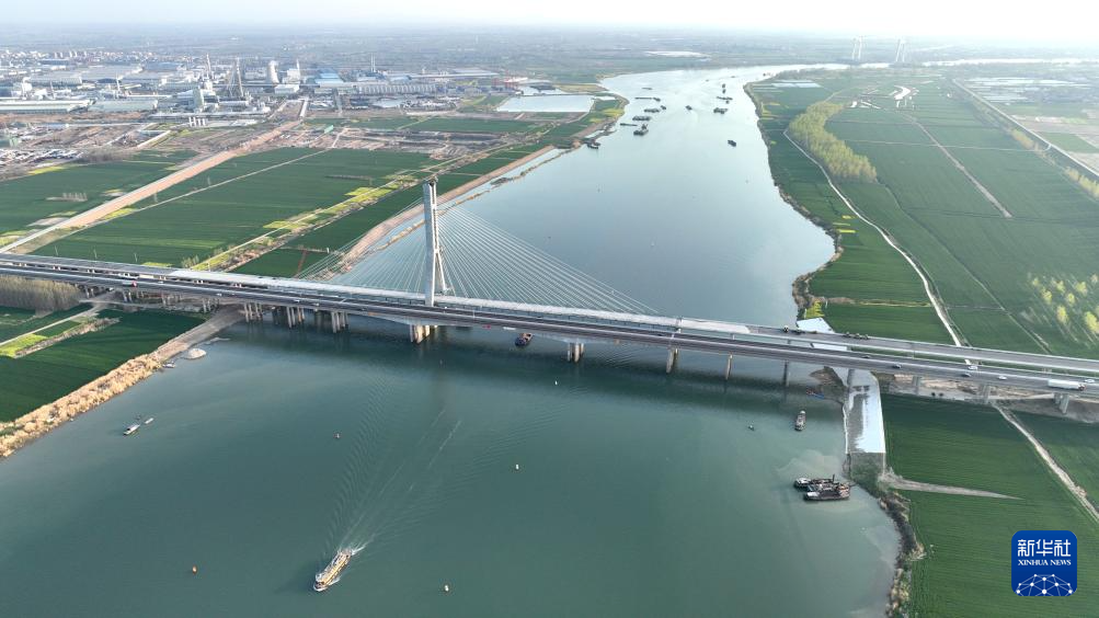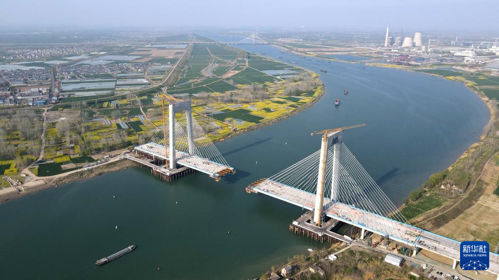 这是位于滁州市凤阳县的G329临淮关跨淮河特大桥建设现场(4月2日摄,无人机照片)。