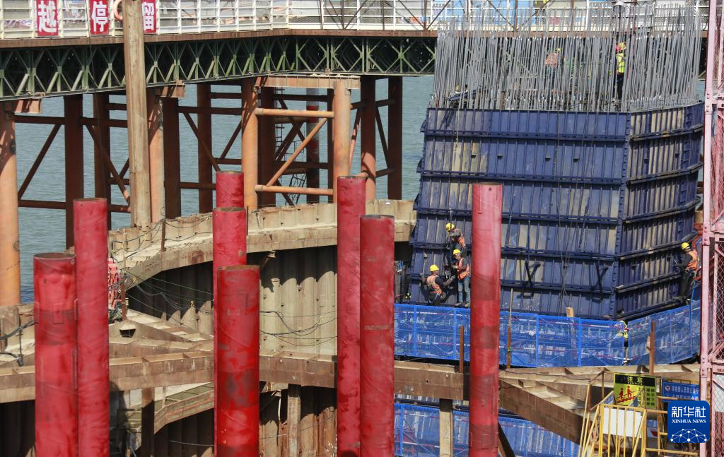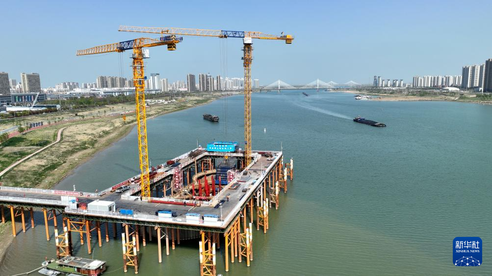 4月2日,中铁四局施工人员在蚌埠市延安路跨淮河大桥建设现场作业。