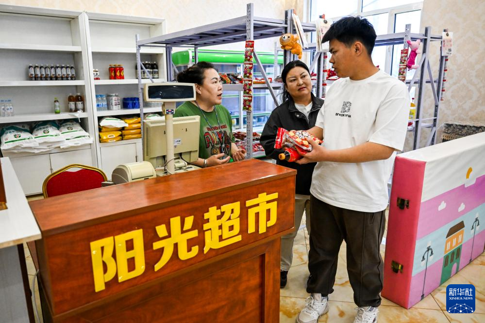 3月31日,在呼和浩特市残疾人托养中心,胡日(右)在康复教师郭芳(左)引导下购买零食。乌尼尔其其格会定期带胡日到专业的康复机构进行社会适应训练,针对性地提升胡日的沟通交流等能力。