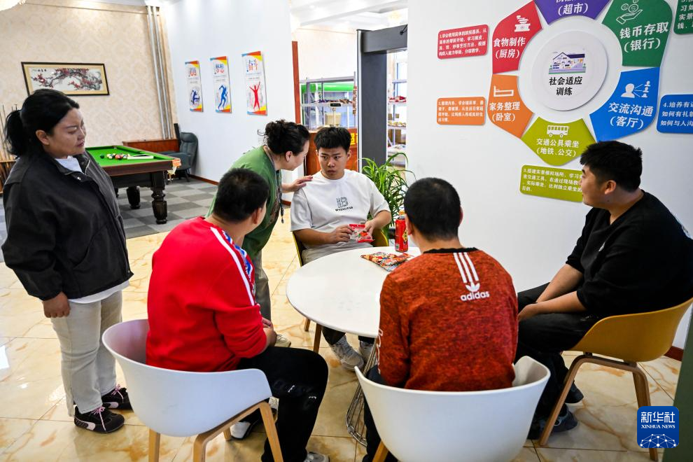 3月31日,在呼和浩特市残疾人托养中心,胡日(右三)在康复教师郭芳(左三)引导下与小伙伴分享零食。乌尼尔其其格会定期带胡日到专业的康复机构进行社会适应训练,针对性地提升胡日的沟通交流等能力。