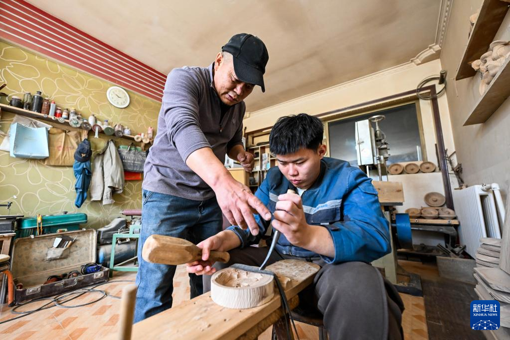3月31日,在位于呼和浩特市赛罕区的一家木雕工作室,胡日(右)在父亲苏龙嘎的指导下制作木盘。