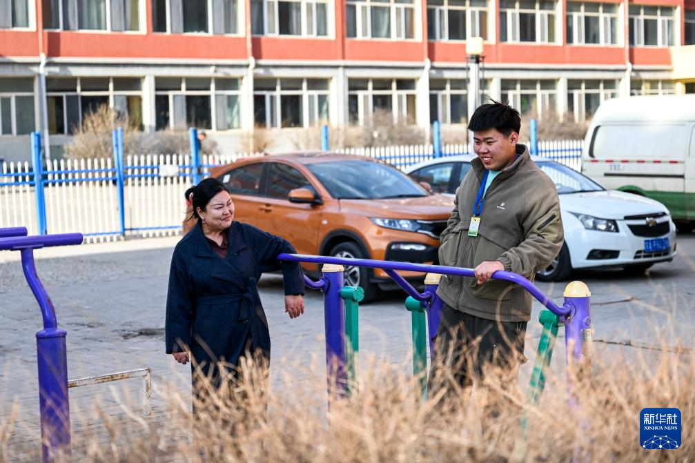 3月30日,在位于呼和浩特市新城区的一口袋公园,母亲乌尼尔其其格(左)陪着胡日锻炼身体。