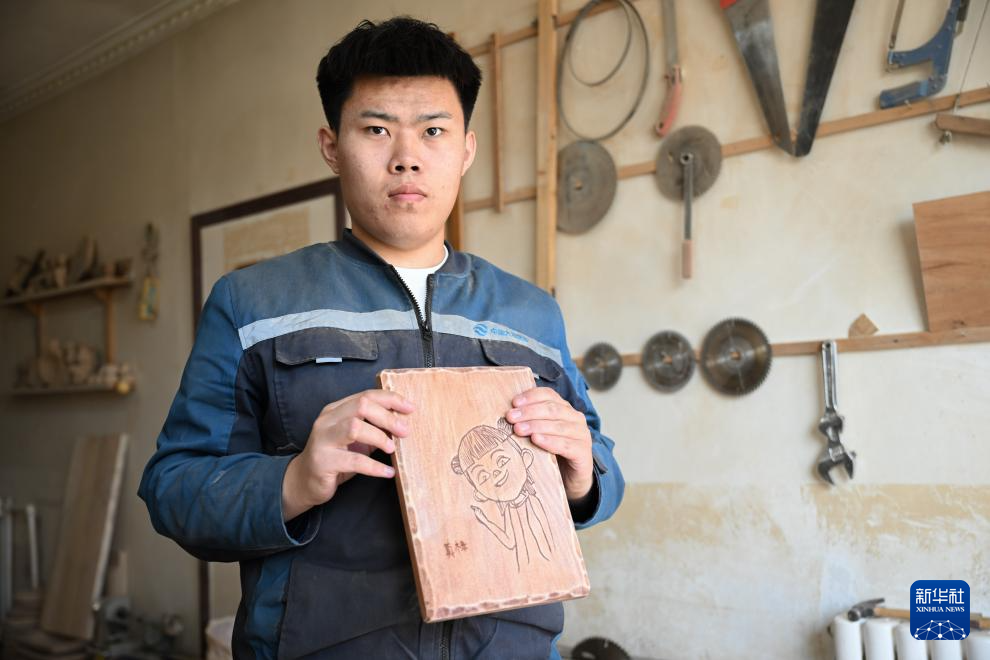 3月31日,在位于呼和浩特市赛罕区的一家木雕工作室,胡日展示自己创作的木板画。